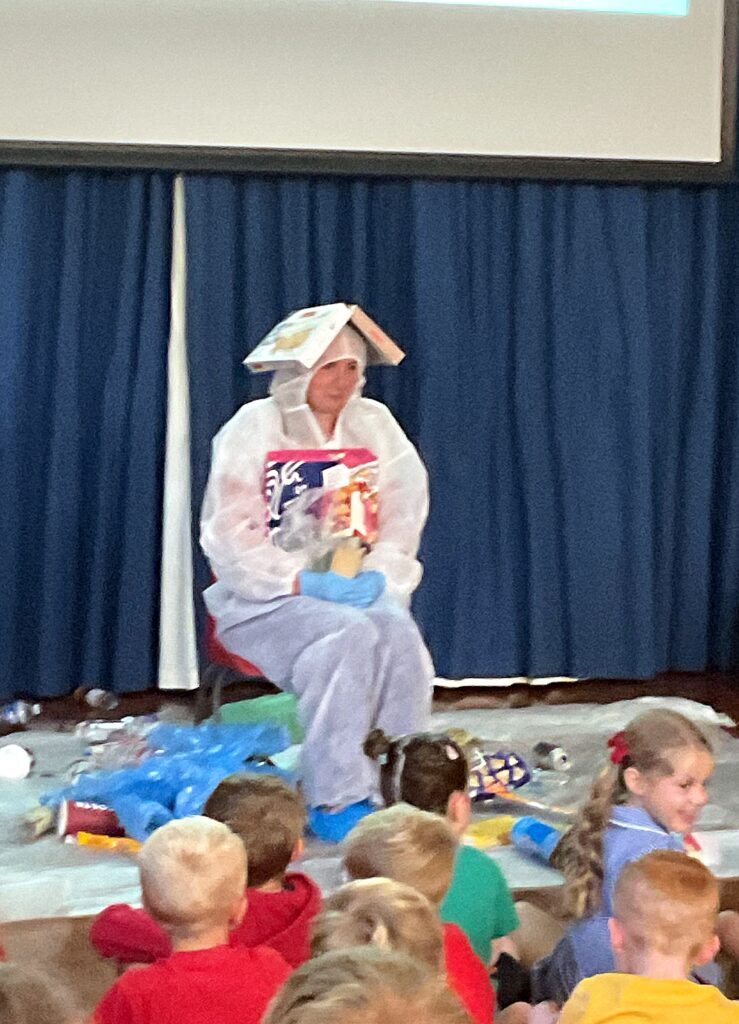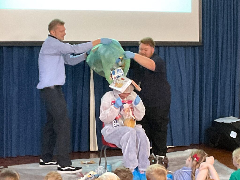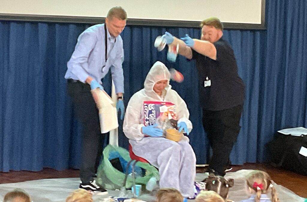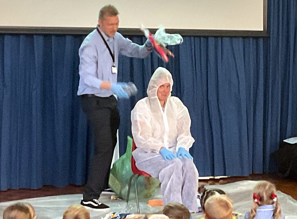 Many thanks to headteacher Mrs Douglas for allowing AJ and Jack to throw rubbish over her!