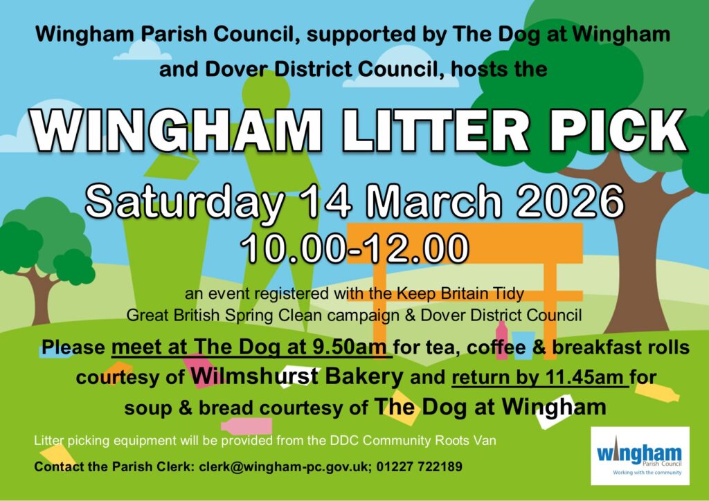 Wingham Parish Council will be signing up to the Keep Britain Tidy Great British Spring Clean campaign for 2026 when it opens on 13th February. See their website for more information: https://www.keepbritaintidy.org/our-work/eliminating-litter/great-british-spring-clean